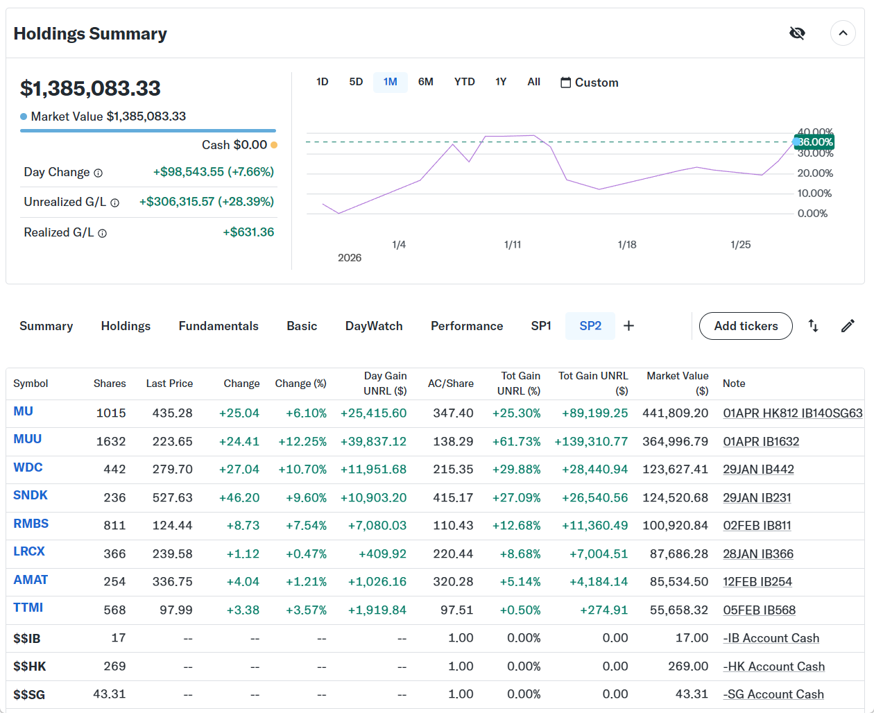 Day Changeは+$98,543.55(+7.66%)の大きなプラスでザラ場は引けた。まだ1月は終わっていないが年初から40万ドル近い含み益が出ている。AI相場の中心がソフトウェア系から半導体セクターに移行して、相場の波に乗れた事によるもの。
