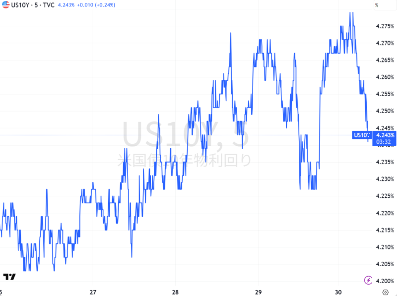 米国債10年金利の5日間チャート。FOMCで一旦上げた金利が下がって来たが、全体としては上昇傾向。