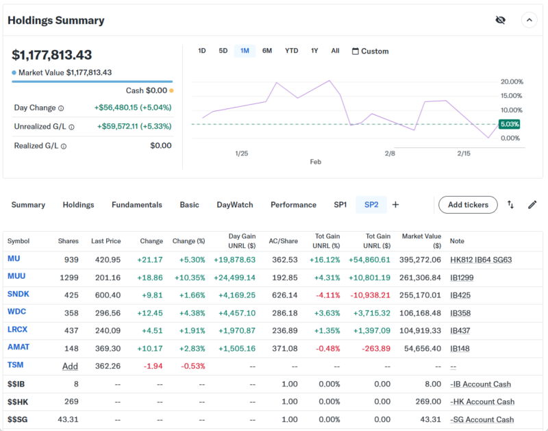 持ち株の方は、半導体ファンドリー大手のTSMC(TSM)を売却して、その資金で先日売った半導体製造装置のAMATを買い戻した。その他は変更なし。