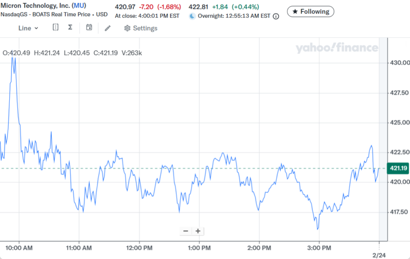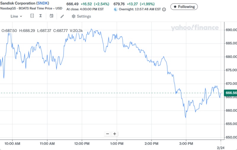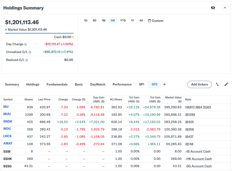 Day Changeは-$12,113.47(-1.00%)のマイナスでザラ場は引けた。SNDKはMUやWDCよりも時価総額が小さくて、資金が入ると上がりやすい。WDCからスピンオフしてからずっと買われて成長している銘柄。東芝の事業整理の時にSDカードのパテントを買い取って、その後にWDCに買収されて、昨年スピンオフされた。最近はWDCがスピンオフの時に保有した株まで売られているがSNDKの株価は伸びている。持ち株の構成は、メモリ(MU)、ストレージ(WDC、SNDK)、半導体製造装置(LRCX、AMAT)になってる。半導体企業でもAI特需で上がる所とそうでない所がある。
