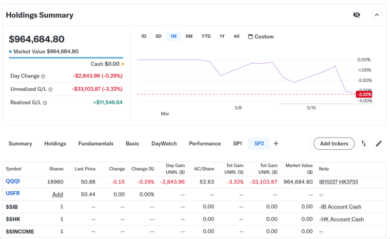 Day Changeは-$35,585.35 (2.85%)のマイナスでザラ場は引けた。上の画像のDay Changeは本日は複数の売買をしたので正しく表示されていない。その為、前日の終値のマーケットバリューと本日の終値のマーケットバリューから正確なDay Changeを計算した。