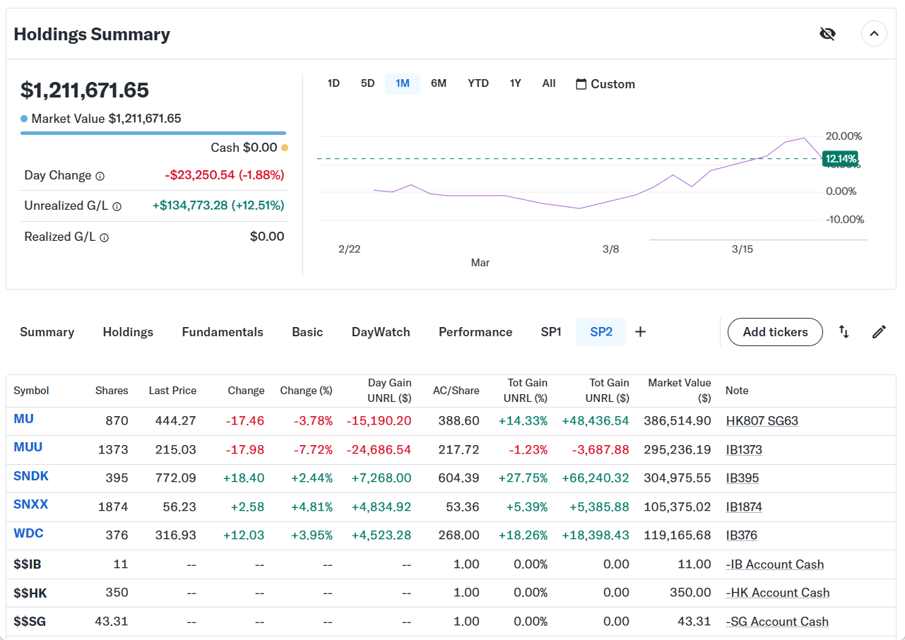 持ち株の方は、プレマーケットが開いた時点で大きなマイナスだったので、レバ2倍のマイクロン(MUU)、サンディスク(SNXX)を一旦全部売却した。ザラ場の後半にネタニヤフ発言で相場が回復してきたので両方とも買い戻したが、取得単価が上がって数量も少なくなったが仕方がない。