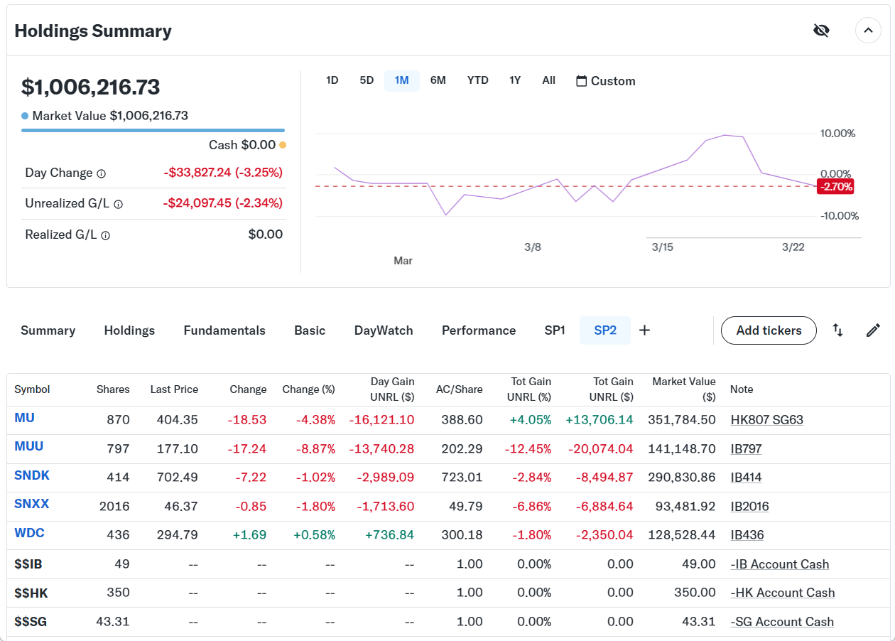 持ち株の方は、プレマーケットが始まった段階で大きなマイナスだったので、メモリのマイクロン(MU)と高配当QQQI以外は全部処分した。しばらくして上でも書いたトランプ発言でプレマーケットで株価が爆上げしだしたので買い直した。その後はイラン発言で指数は大きく影響は受けなかったが半導体セクターが再度大きく下がり始めて相場は引けた。入ったり出たりでゴリゴリ含み益が削られている感じ。ガチホは性に合わないし、ノーポジはイライラするし苦手な展開が続いている。